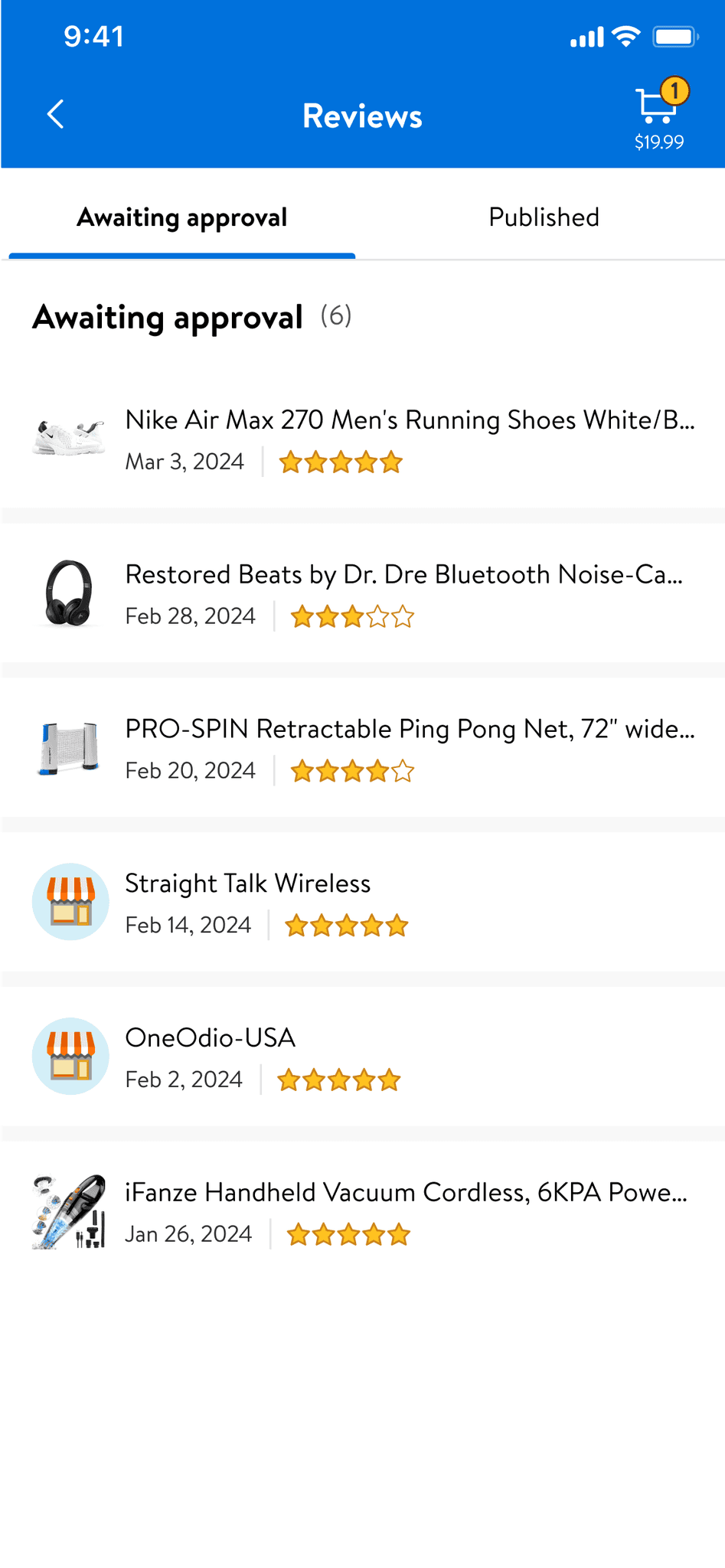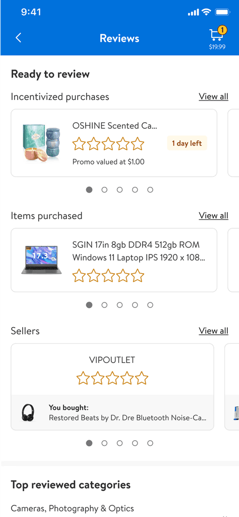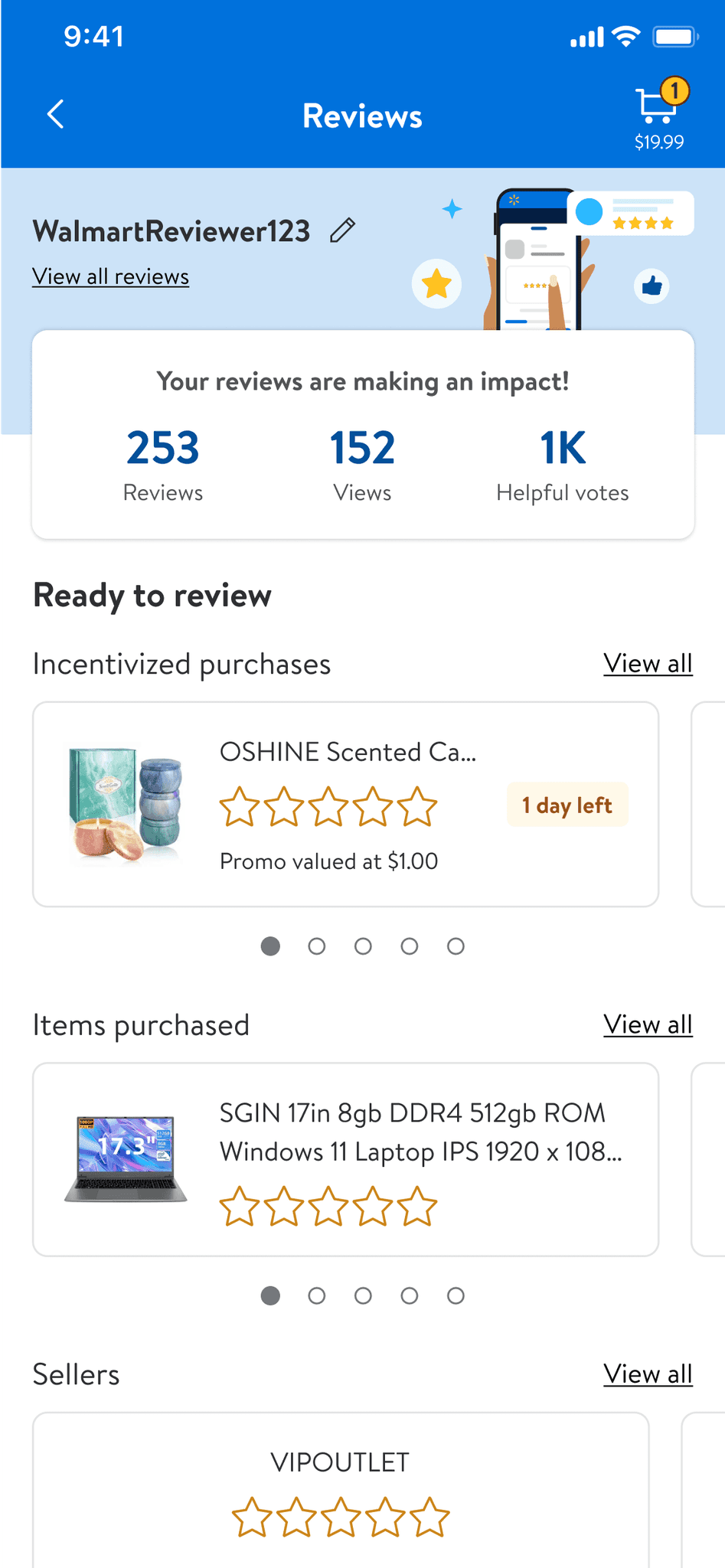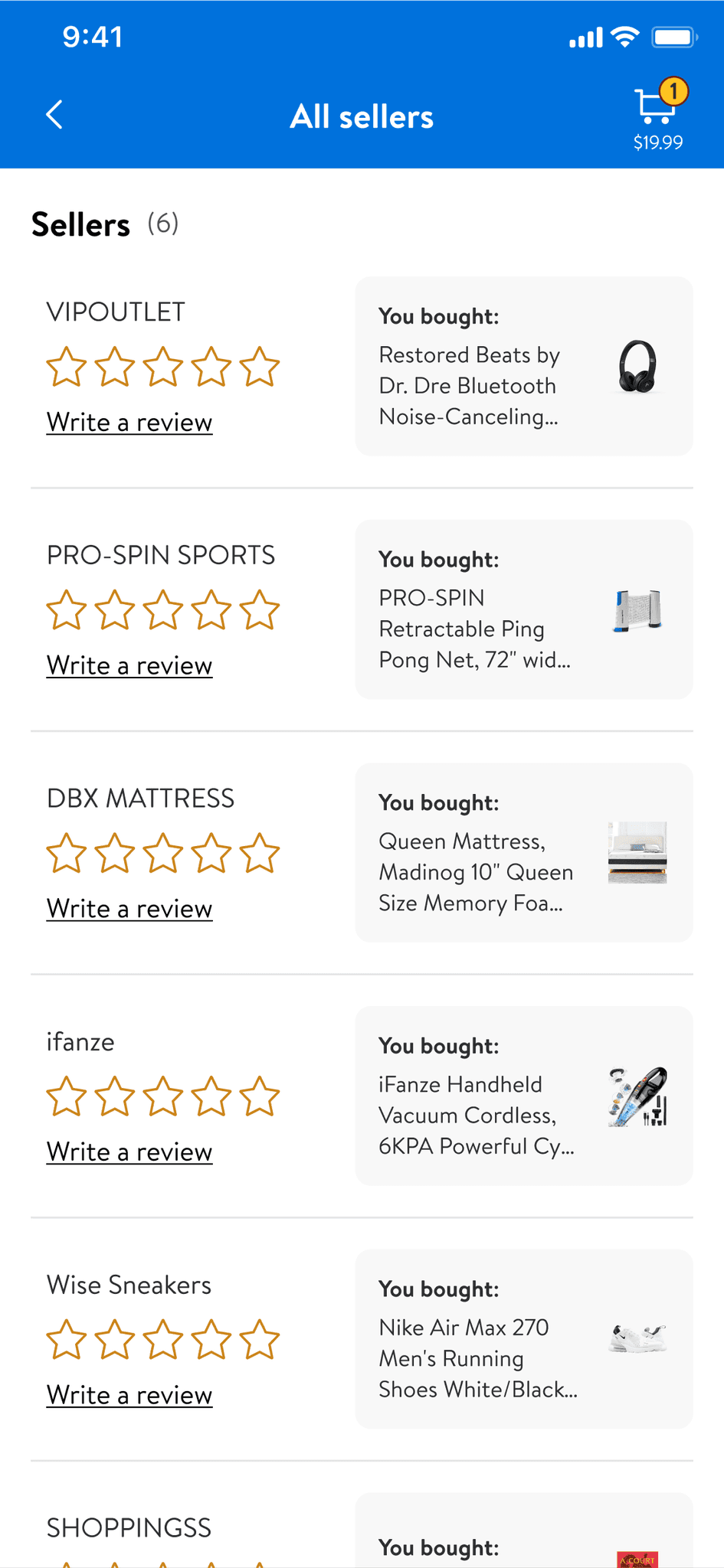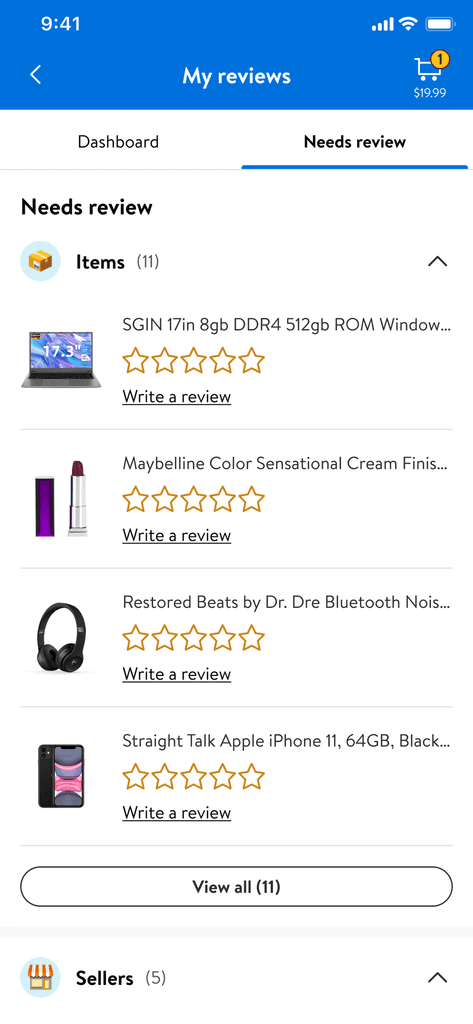 Users can view all reviewable items and sellers in one place.