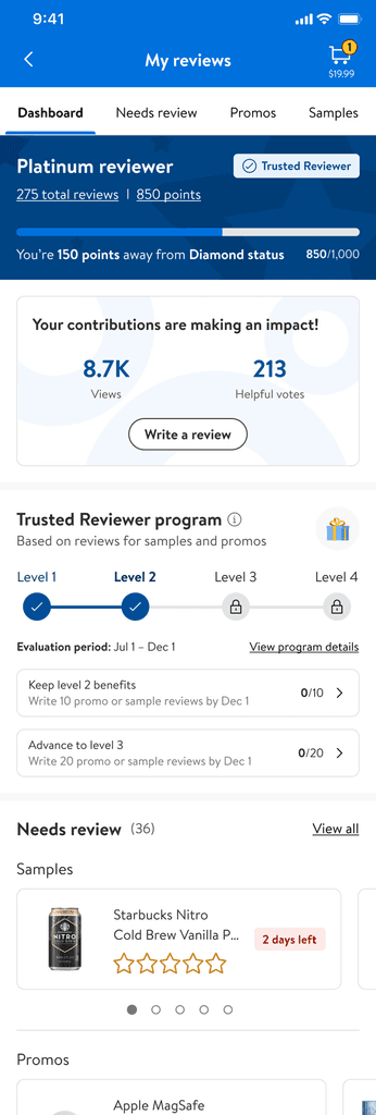 The initial plan included an impact module, but to avoid delays, I advocated for launching the core experience first, ensuring a centralized review hub was available before holiday shopping. This allowed us to gather early insights, refine iterations, and drive engagement, validating the need for a centralized review space while enabling future enhancements.